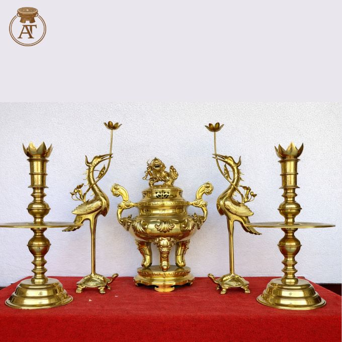 Bộ ngũ sự đồng cát tút là bộ đồ thờ gồm đỉnh hương, đôi hạc và đôi chân nến, được đúc từ hợp kim đồng cát tút chất lượng cao. Chất liệu này nổi bật bởi màu sắc vàng sáng sang trọng, độ bền cao và khả năng giữ vẻ trang nghiêm lâu dài, rất phù hợp cho không gian thờ cúng gia tiên và nhà thờ họ. Tại đồ đồng An Thịnh, bộ sản phẩm được chế tác kỳ công từ đồng cát tút nguyên chất, bảo đảm thẩm mỹ và chất lượng vượt trội.