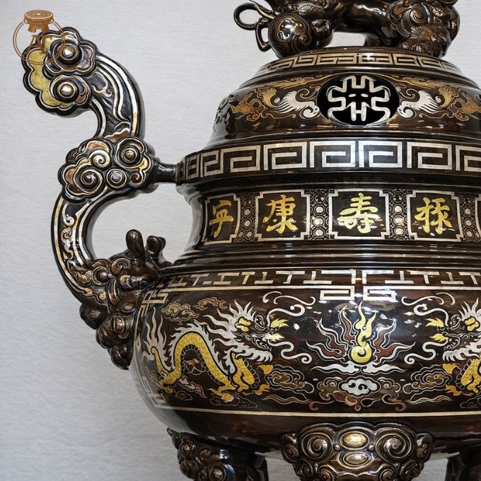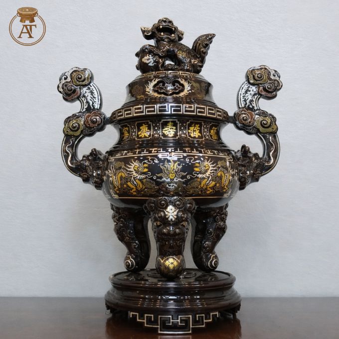 • Đỉnh hương: Đỉnh thiết kế ba chân vững vàng, thân tròn khảm chữ Thọ và hoa văn phong thủy cầu kỳ. Nắp đỉnh có nghê chầu oai phong, tai cầm uốn lượn mềm mại.