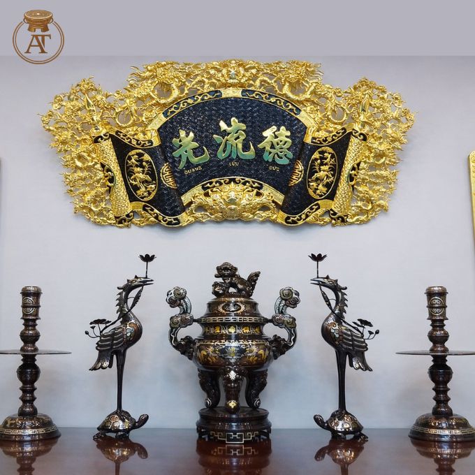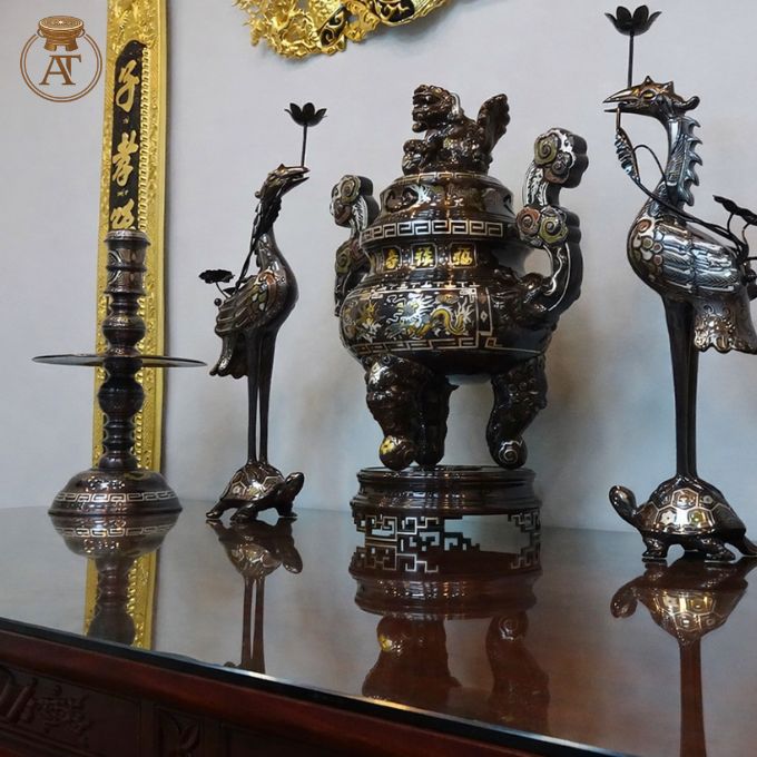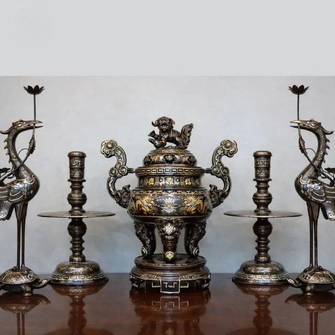 Bộ Ngũ Sự Khảm Ngũ Sắc giữ vai trò trung tâm trong không gian thờ cúng truyền thống, thể hiện sự chỉn chu và lòng thành kính của gia chủ đối với tổ tiên. Sự kết hợp tinh xảo giữa chất liệu đồng và nghệ thuật khảm ngũ sắc không chỉ tôn lên vẻ trang nghiêm cho bàn thờ.
