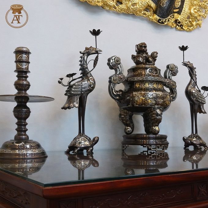 • Kiểu dáng, bố cục: Bộ sản phẩm gồm một đỉnh hương, hai hạc chầu đồng và hai chân nến, sắp đặt cân đối, thống nhất, tạo thế vững chãi và hài hòa.