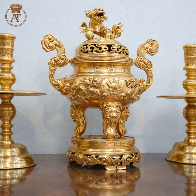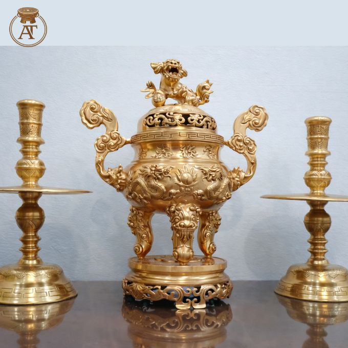 • Kiểu dáng, tạo hình: Đỉnh đồng có dáng bầu chắc chắn, cấu trúc ba chân vững chãi, nắp đỉnh nổi bật với tượng Nghê chầu oai vệ, hai bên là tay cầm hình mây uốn lượn mềm mại. Đôi chân nến thiết kế thân trụ cao, tán nến tròn đều, bệ đỡ chắc chắn.