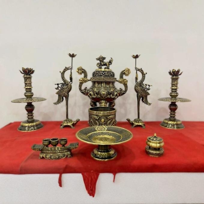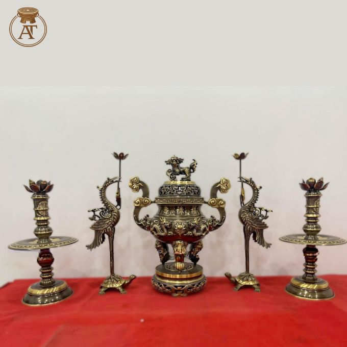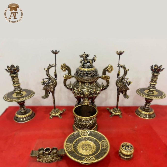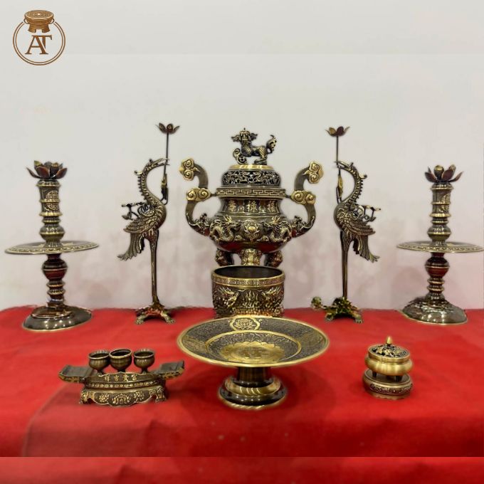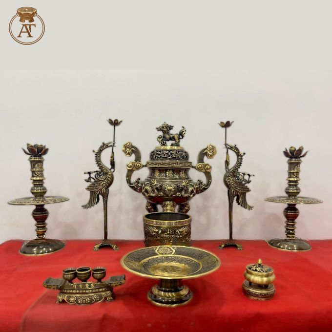 • Thiết kế tổng thể: Bộ sản phẩm gồm đỉnh đồng, hạc chầu, chân nến, mâm bồng, hộp trầm, kỷ chén… bố cục cân đối, hài hòa, dễ sắp xếp lên bàn thờ.