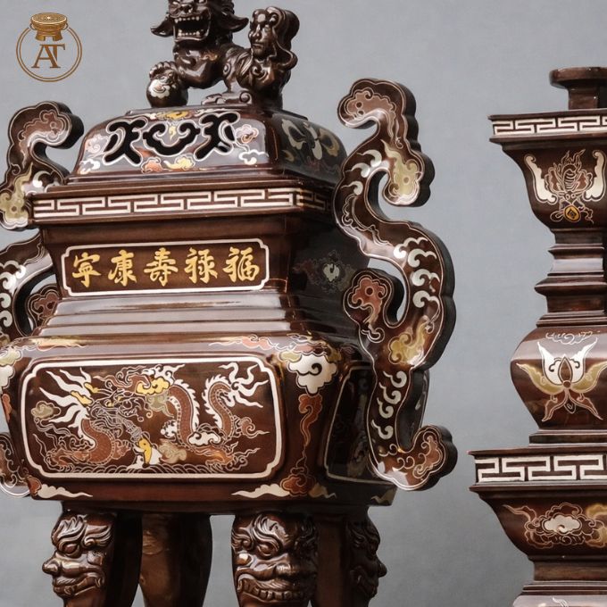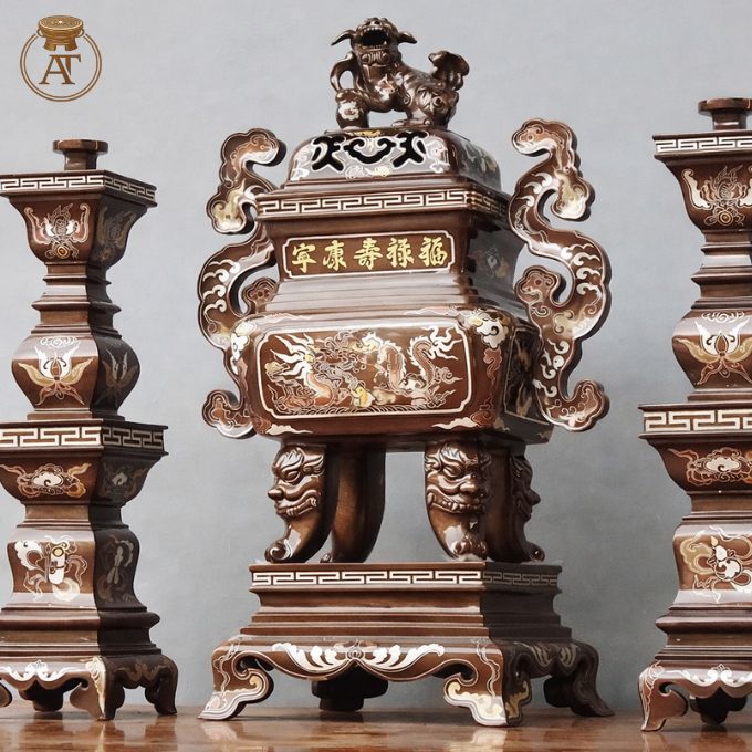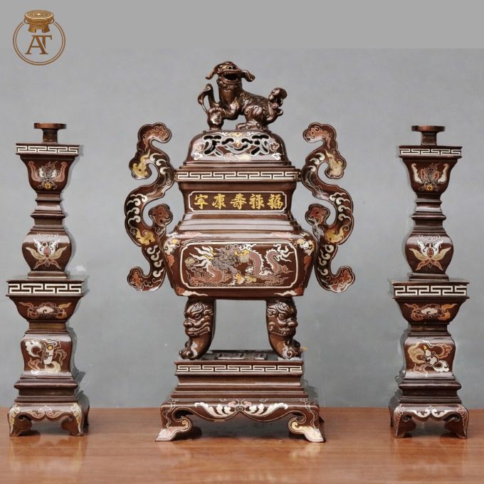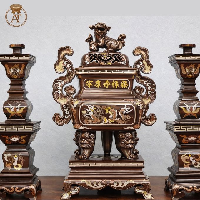 • Với kỹ thuật khảm ngũ sắc tinh tế, bộ đỉnh đồng phù hợp trưng bày trang trọng trong không gian thờ gia tiên, bàn thờ Phật hoặc nhà thờ họ.