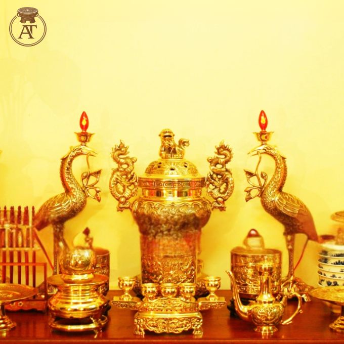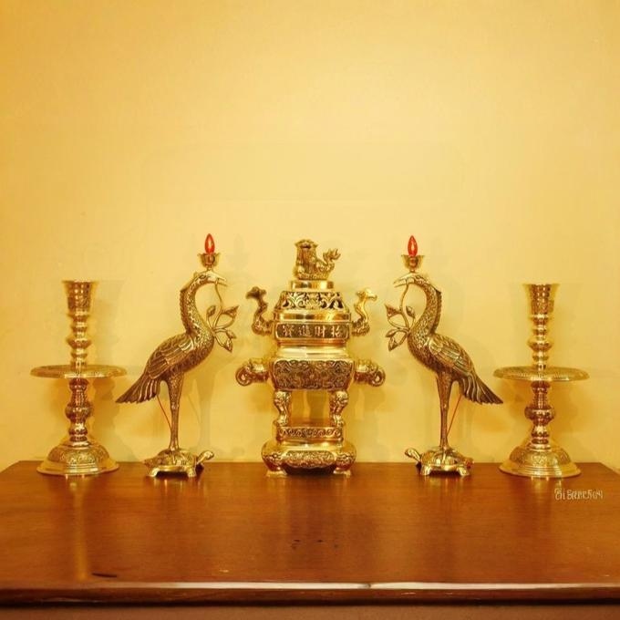 Thành phần đầy đủ: Bộ sản phẩm gồm lư hương, đôi hạc chầu, chân nến, ống hương, mâm bồng, đỉnh đồng, lọ hoa, ấm chén thờ… tất cả bài trí cân đối và hòa hợp về phong cách.