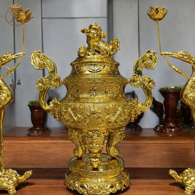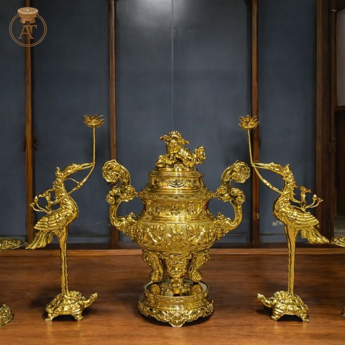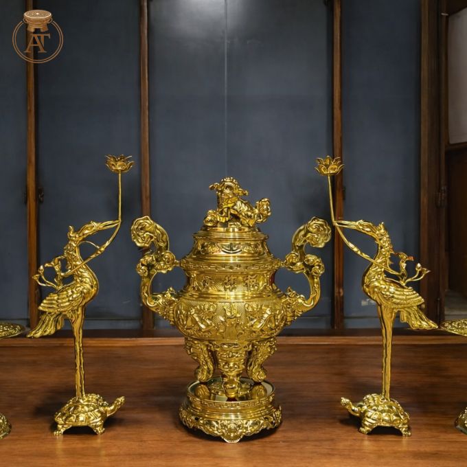 Bộ đồ thờ dát vàng được chế tác cầu kỳ với đường nét chạm khắc sinh động, sắc sảo. Bộ sản phẩm gồm đỉnh đồng, đôi hạc đứng trên lưng rùa và hai chân nến, tạo nên bố cục cân đối và hài hòa. Lớp vàng dát ngoài bóng sáng, tôn lên vẻ cao cấp và sang trọng cho tổng thể sản phẩm.