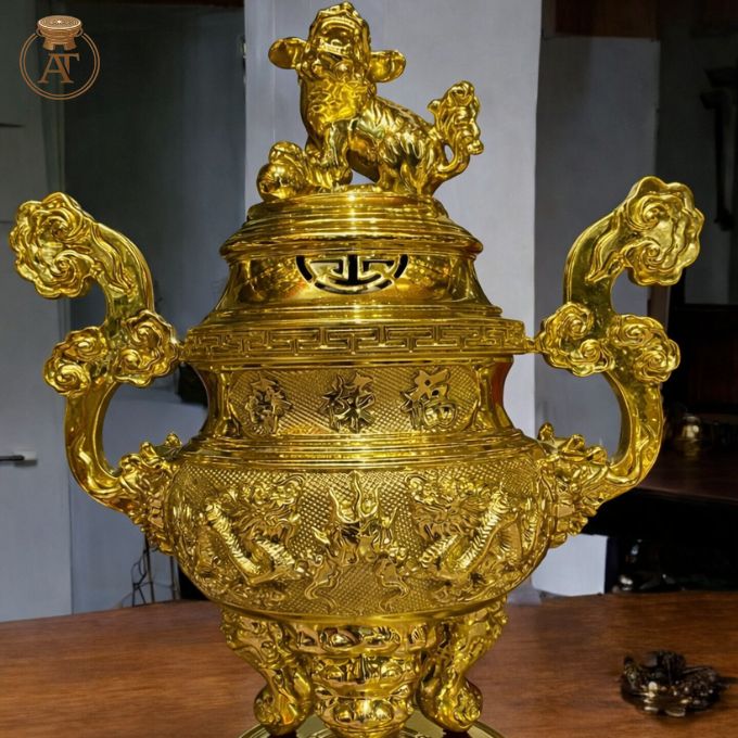 Đỉnh đồng dát vàng được chế tác hoàn toàn thủ công bởi nghệ nhân lành nghề, đảm bảo giữ trọn thần thái truyền thống tại An Thịnh.