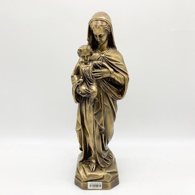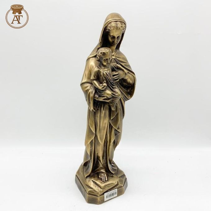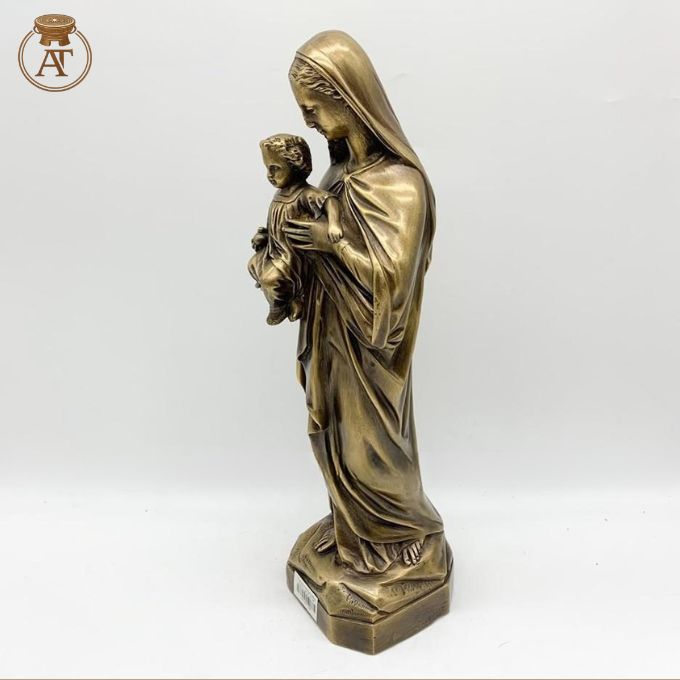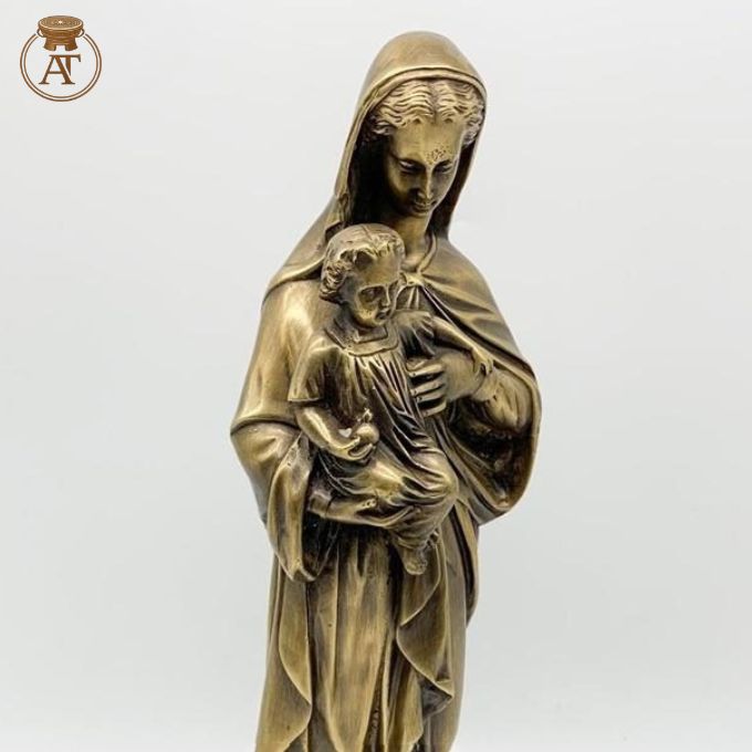 Tượng Đức Mẹ Maria đồng hun giả cổ được chế tác tỉ mỉ với dáng đứng ôm Chúa Hài Đồng, thể hiện sự tinh xảo trong nghệ thuật đúc đồng truyền thống kết hợp hoàn thiện bề mặt giả cổ sang trọng.