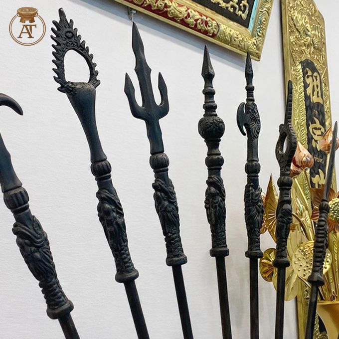 Bộ bát bửu bằng đồng được chế tác hoàn toàn thủ công bởi nghệ nhân lành nghề, đảm bảo giữ trọn thần thái truyền thống tại An Thịnh.