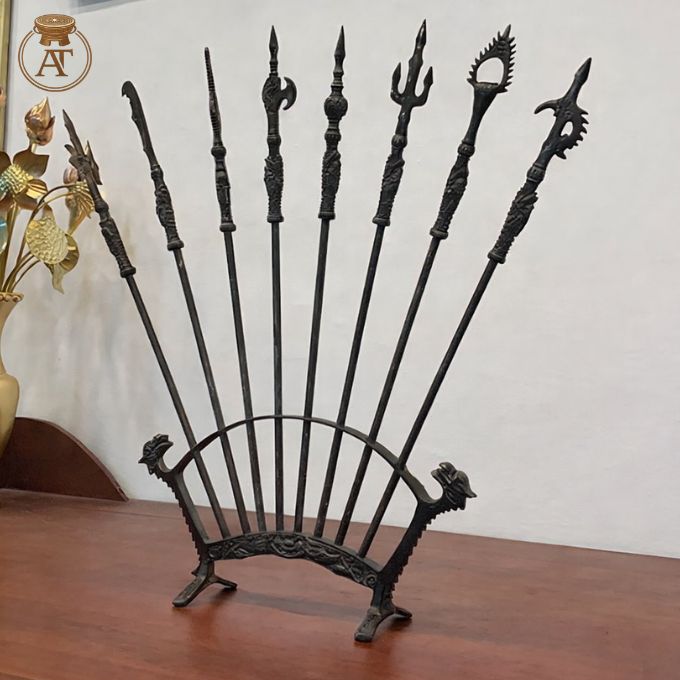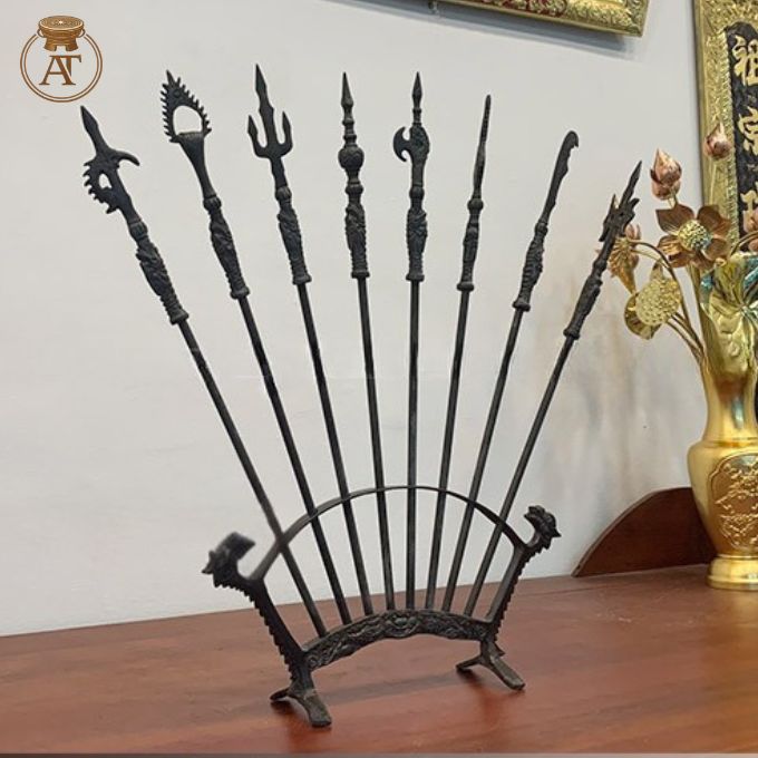 Bộ Bát Bửu tại An Thịnh gồm 8 món pháp khí truyền thống, mỗi món đều được chế tác tinh xảo, thể hiện rõ nét nghệ thuật chạm khắc đồng cổ điển.