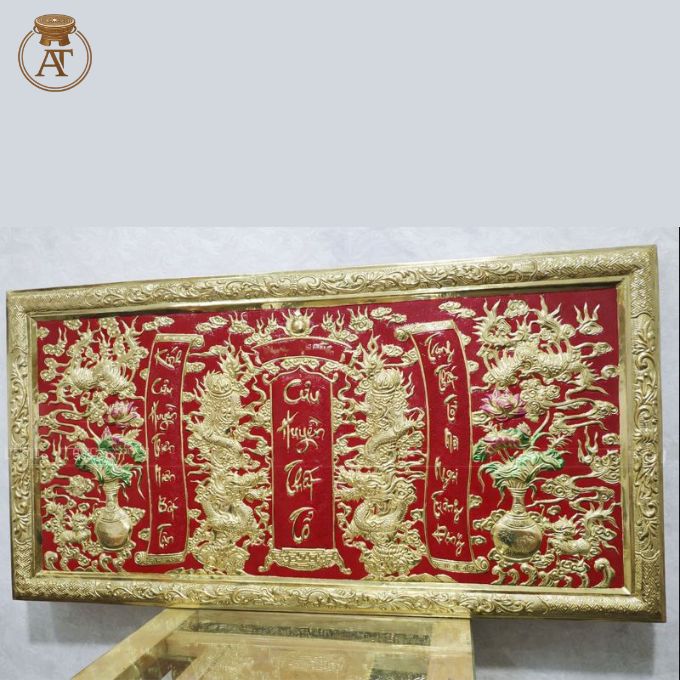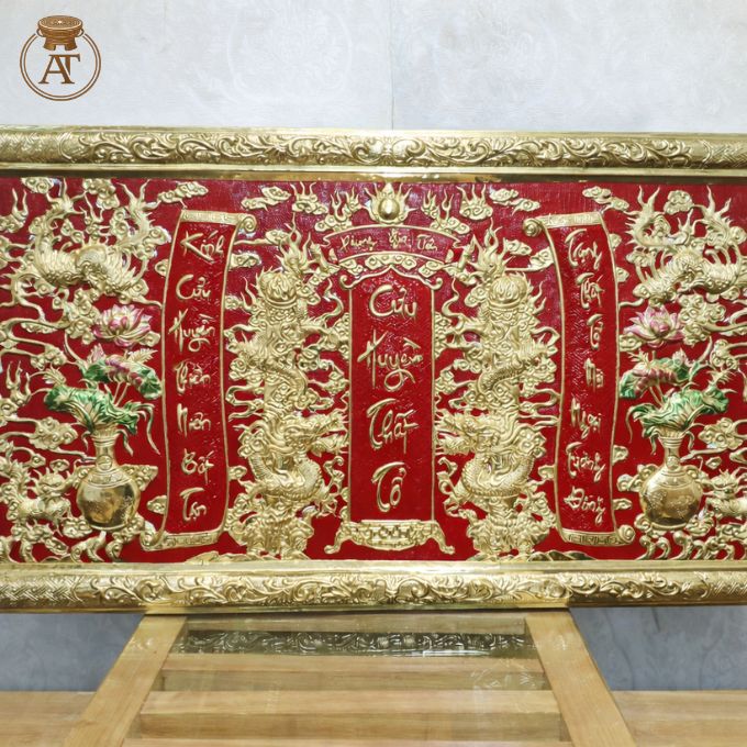 Sản phẩm chế thủ công tinh xảo, nổi bật với nền đỏ sơn son truyền thống kết hợp hoa văn chạm nổi sắc nét. Thiết kế sang trọng giúp tạo điểm nhấn mạnh mẽ cho không gian thờ tự.