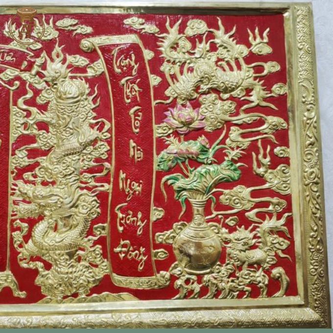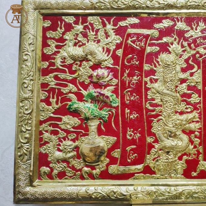• Màu sắc và chất liệu: Nền đỏ sơn son kết hợp sắc vàng đồng nổi bật tạo sự tương phản bắt mắt. Các chi tiết như hoa sen và bình hoa được điểm xuyết màu sắc nhẹ nhàng, tăng sự sinh động cho tổng thể tranh.