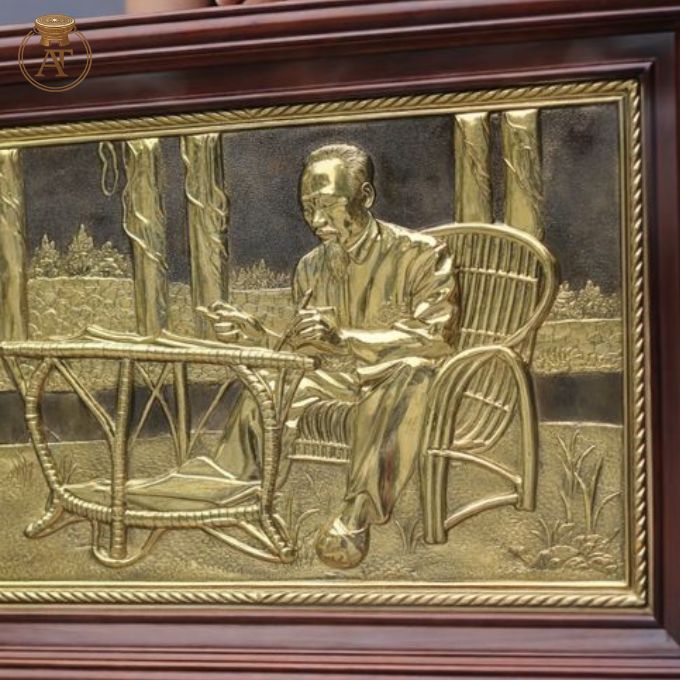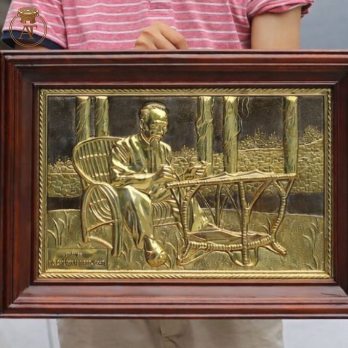 Tranh Đồng Bác Hồ ngồi làm việc là mẫu tranh nghệ thuật thủ công sắc nét, tái hiện hình ảnh Chủ tịch Hồ Chí Minh đang làm việc ngoài hiên nhà sàn. Từng chi tiết được chạm nổi tinh xảo trên nền đồng vàng, kết hợp khung gỗ sơn giả cổ, tổng thể bức tranh vừa sang trọng vừa sống động.