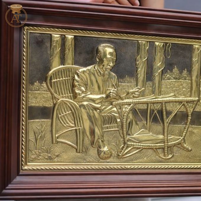 Tranh đồng Bác Hồ ngồi làm việc mang giá trị biểu tượng thiêng liêng, phù hợp trưng bày tại phòng khách, phòng làm việc hoặc cơ quan. Tại xưởng chế tác An Thịnh, từng bức tranh được chạm khắc tỉ mỉ bằng chất liệu đồng tinh khiết, thể hiện thần thái và cốt cách của vị lãnh tụ vĩ đại.