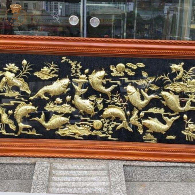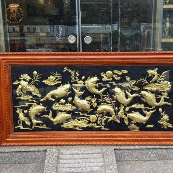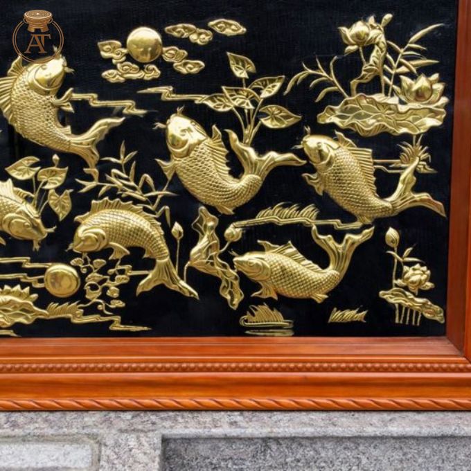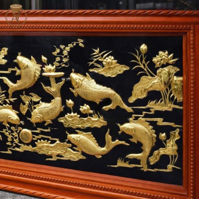 Màu sắc, xử lý bề mặt: Mặt tranh sử dụng nền hun đen, tạo độ tương phản mạnh với màu đồng vàng của các chi tiết nổi. Nhờ đó, hình ảnh cá chép trở nên nổi bật, rõ nét và có chiều sâu.