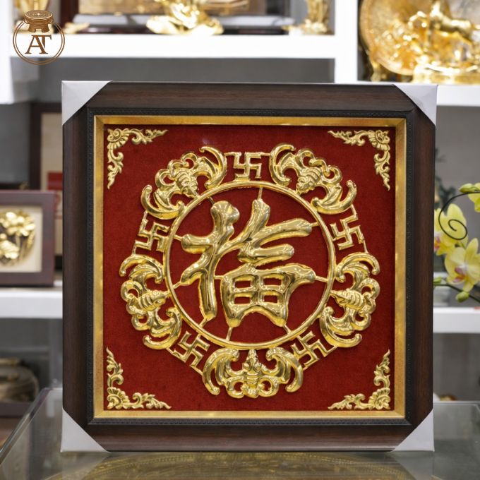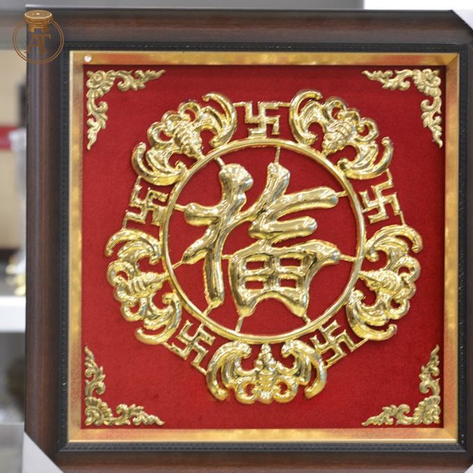 • Kiểu dáng, bố cục: Tranh có khung vuông chuẩn chỉ, trung tâm là chữ “Phúc” chế tác nổi, bao quanh là họa tiết hoa văn và các biểu tượng trang trí cân xứng ở bốn góc tạo nên sự bề thế và chắc chắn.