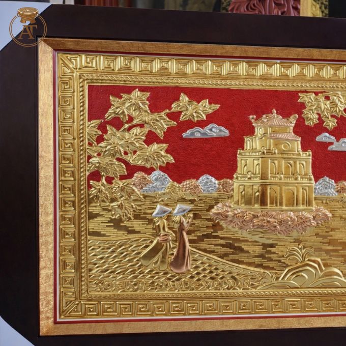 Tranh Hồ Gươm mạ vàng là tác phẩm nghệ thuật tái hiện biểu tượng linh thiêng của Thăng Long – Hà Nội. ược chế tác thủ công từ đồng nguyên tấm kết hợp mạ vàng 24K. Tại Đồ Đồng An Thịnh, bức tranh Hồ Gươm mạ vàng đều được thực hiện trực tiếp tại xưởng làng nghề truyền thống.