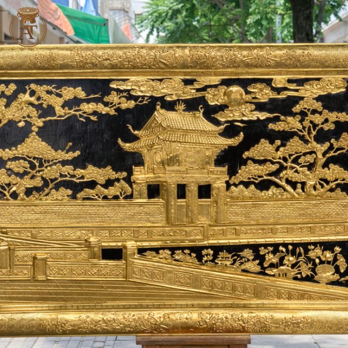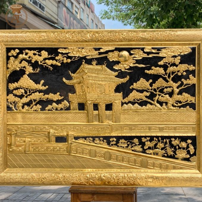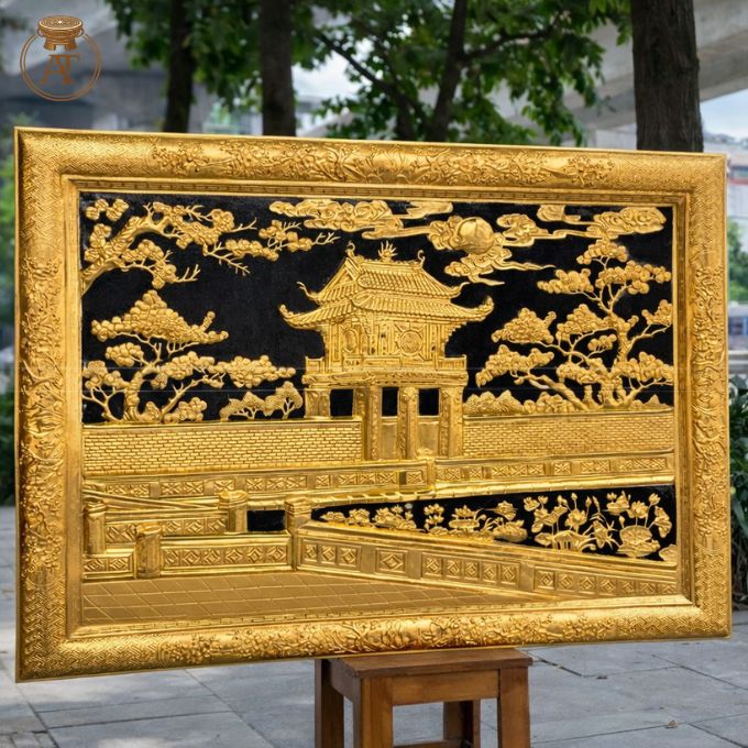 Tranh mạ vàng chế tác tại An Thịnh sở hữu độ tinh xảo cao, giữ trọn kiến trúc cổ kính nguyên bản, kết hợp ánh vàng sang trọng với đồng nguyên chất, tạo nên dòng tranh cao cấp hài hòa giữa thẩm mỹ, kỹ thuật và giá trị tinh thần truyền thống.