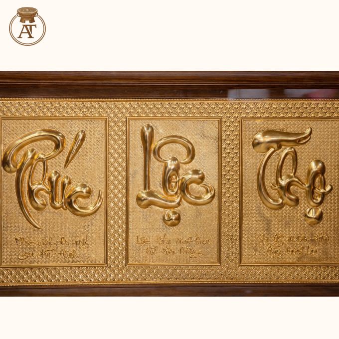 Tranh Phúc Lộc Thọ mạ vàng được chế tác hoàn toàn thủ công bởi nghệ nhân lành nghề, đảm bảo giữ trọn giá trị truyền thống và ý nghĩa phong thủy tốt lành tại An Thịnh.