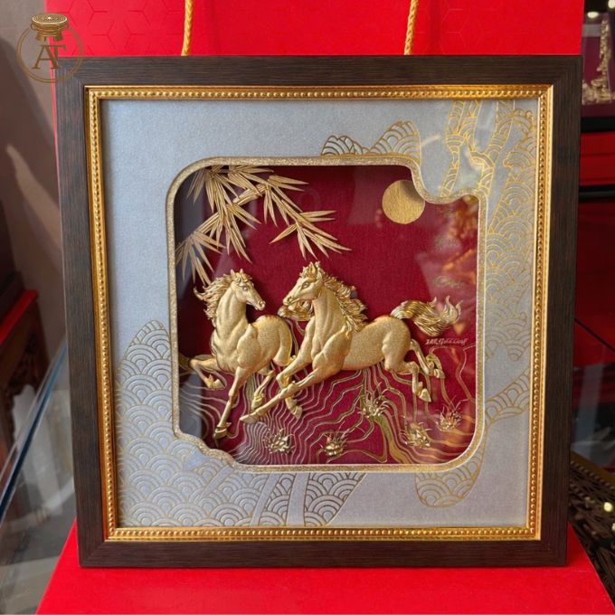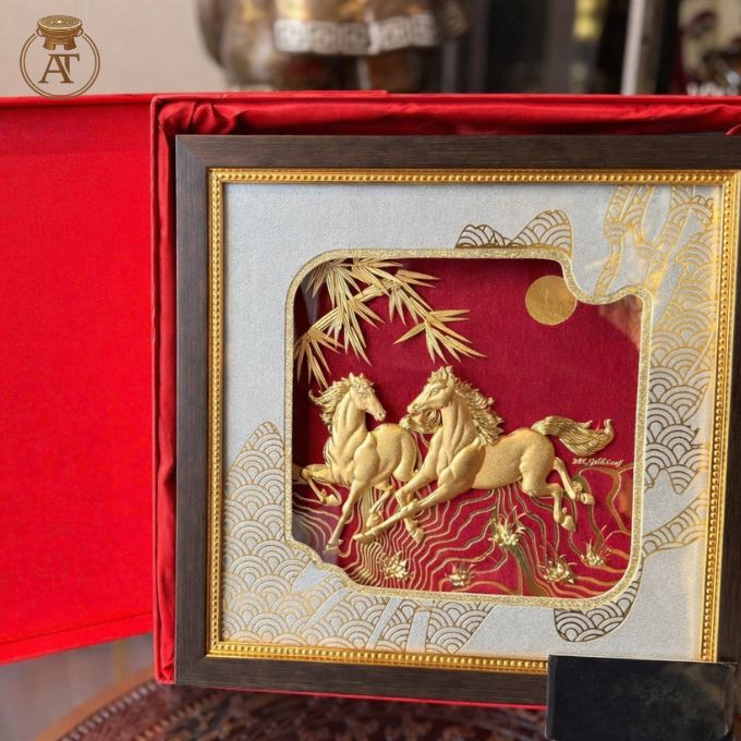 Tranh song mã mạ vàng được chế tác hoàn toàn thủ công bởi nghệ nhân lành nghề, đảm bảo giữ trọn thần thái truyền thống tại An Thịnh.