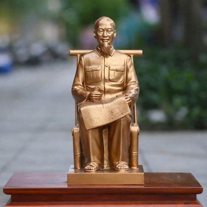 Tượng Bác Hồ ngồi đọc báo là món quà trang trọng, truyền tải tinh thần học tập suốt đời, lý tưởng cho không gian làm việc, sưu tầm. Được đúc đồng thủ công tinh xảo tại xưởng theo chuẩn truyền thống.