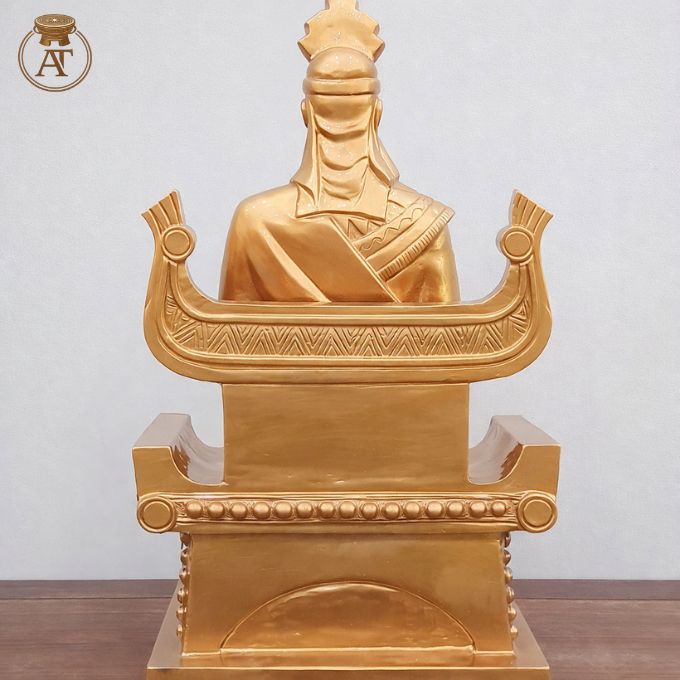 Trang phục, chạm khắc: Áo bào vua dày nếp, nhiều chi tiết hoa văn hình học đặc trưng, tôn lên nét cổ truyền và quyền lực. Giáp chân và tay được chạm kỹ, đồng bộ với phong cách tổng thể.