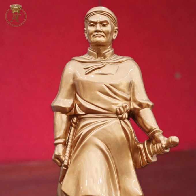 Trang phục, chạm khắc: Áo giáp cổ truyền được xử lý mềm mại theo từng nếp gấp tự nhiên, chi tiết đai lưng, khăn đầu và vạt áo đều được chạm khắc rõ ràng, tạo điểm nhấn sinh động.