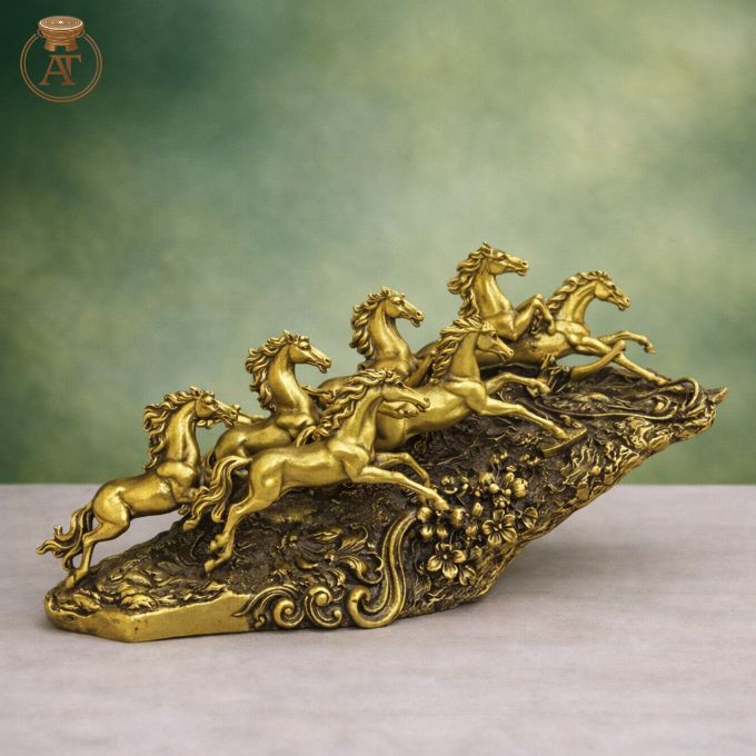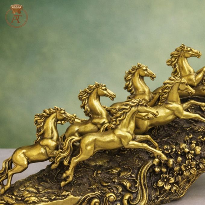 Màu sắc, bề mặt: Màu đồng vàng kết hợp phủ màu giả cổ ở phần nền tạo hiệu ứng tương phản, làm nổi bật đàn ngựa ở phía trước. Bề mặt được xử lý mịn và nhẵn, toát lên vẻ sang trọng, đẹp mắt.