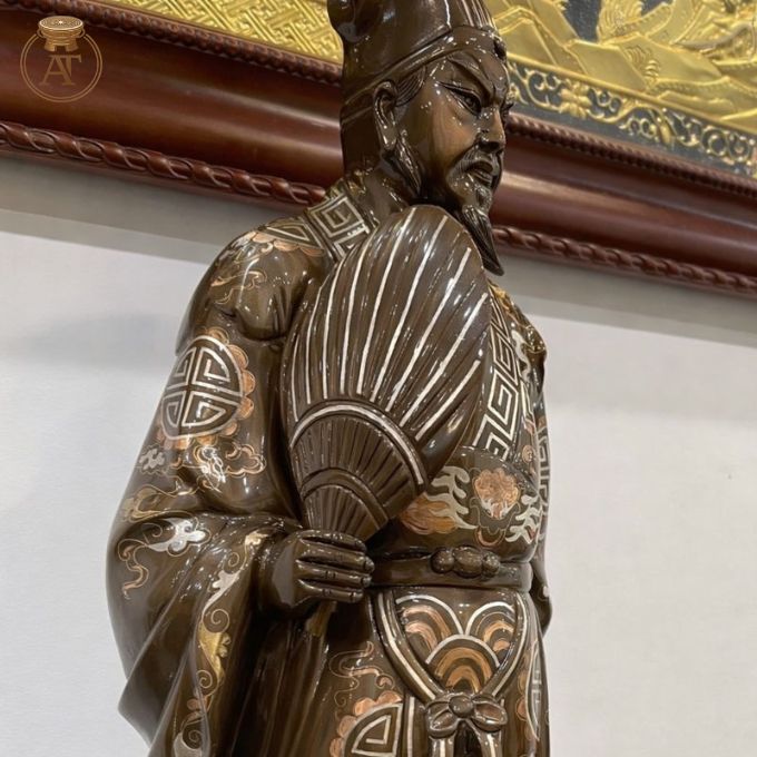 Tác phẩm mang đầy đủ thần thái của Gia Cát Lượng, từ trang phục đến tư thế, được thực hiện bằng kỹ thuật khảm tam khí truyền thống. Đây là lựa chọn lý tưởng cho không gian thờ, phòng khách hoặc làm quà tặng sang trọng.