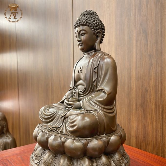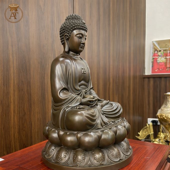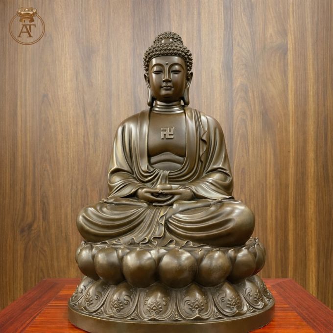 Tượng Phật A Di Đà bằng đồng ngồi thiền trên tòa sen, biểu trưng ánh sáng trí tuệ.