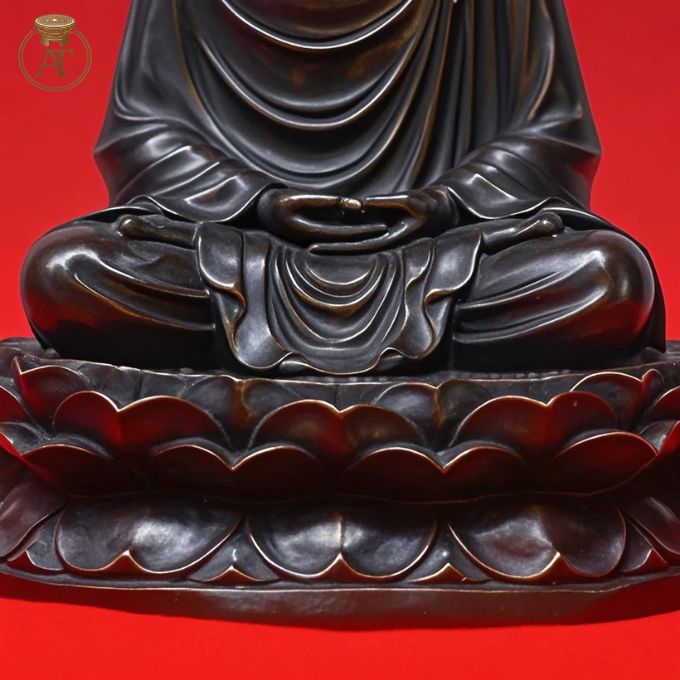 Tượng đồng đen được chế tác từ hợp kim quý, có tỷ lệ đồng nguyên chất kiểm soát nghiêm ngặt. Đồng đen không chỉ bền mà còn mang tính biểu trưng cao về sự trường tồn, thiêng liêng.
