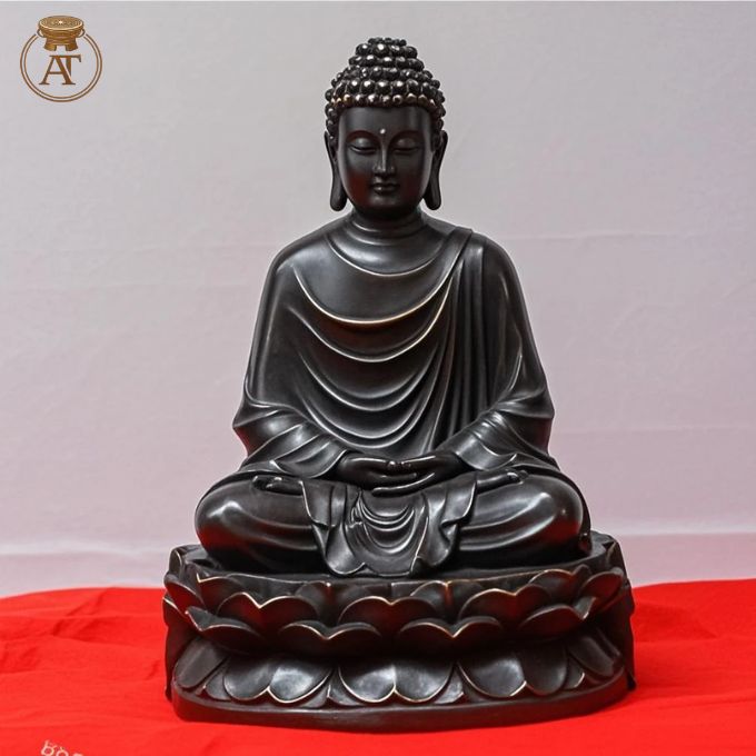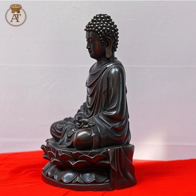 Tượng Phật bằng đồng đen trong tư thế ngồi thiền trên đài sen, ánh mắt từ bi, bề mặt sáng bóng.