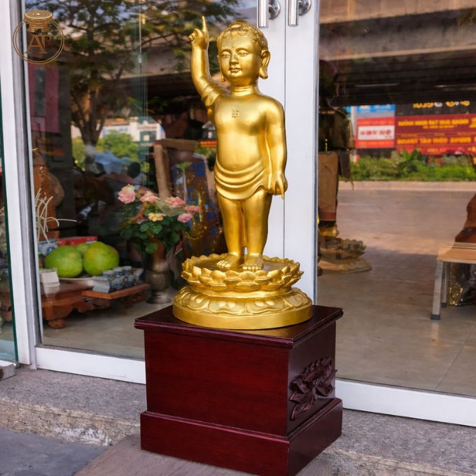 Chất liệu đồng mang lại vẻ đẹp trang nghiêm và khả năng bảo tồn lâu dài theo năm tháng. Tượng đản sanh thường được đặt trong không gian thờ hoặc thiền môn để lan tỏa năng lượng từ bi – trí tuệ.