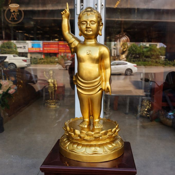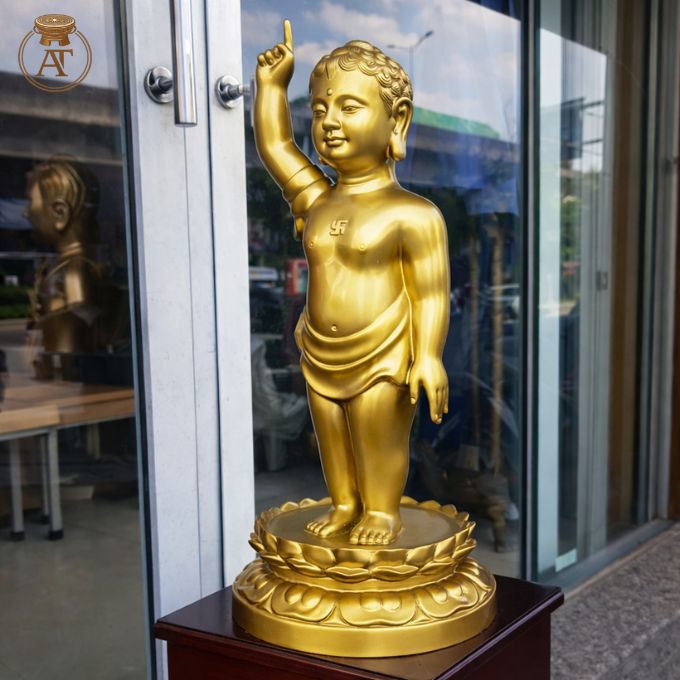 Tượng Phật Đản Sanh bằng đồng là hình ảnh thiêng liêng ghi lại khoảnh khắc Đức Phật Thích Ca vừa mới hạ sinh. Hình ảnh một tay chỉ trời, một tay chỉ đất hàm chứa thông điệp giác ngộ toàn vũ trụ.