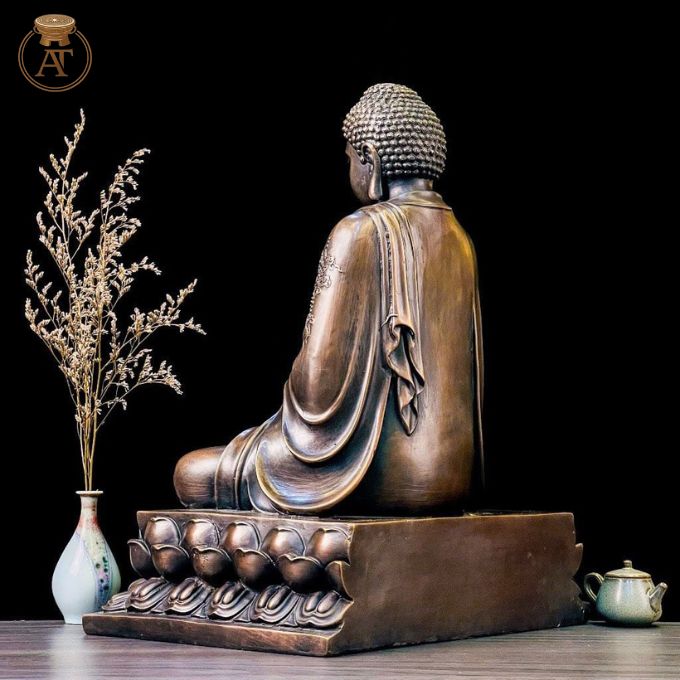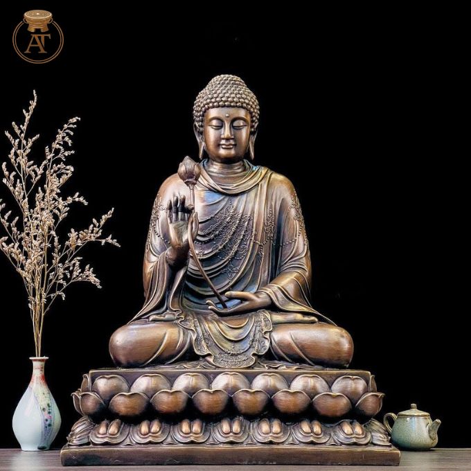 Tượng đồng Phật Thích Ca Mâu Ni sắc đồng cổ trầm mặc, bền vững theo thời gian, mang năng lượng bảo vệ phong thủy.
