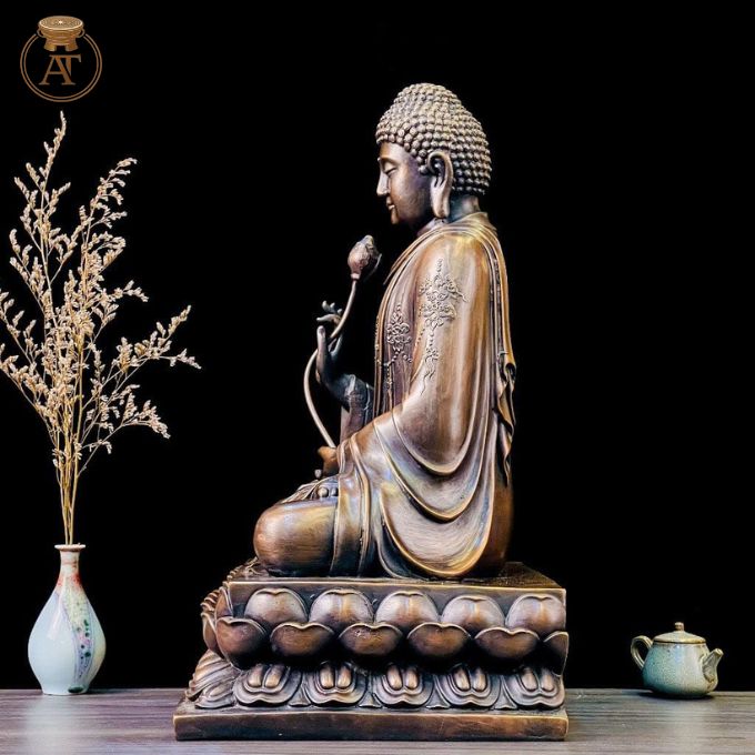 Kiểu dáng, tư thế: Tượng đồng Phật Thích Ca ngồi kiết già vững chãi trên tòa sen chạm khắc nhiều lớp cánh sen uyển chuyển. Tay phải nâng nhẹ đóa sen, tay trái đặt ngửa trên đùi, tạo thành thế thiền định thanh tịnh.
