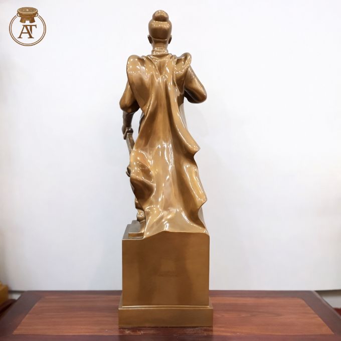 • Kiểu dáng, tư thế: Được tạo hình theo tư thế đứng dũng mãnh, một tay nắm chuôi kiếm, tay còn lại cầm cuốn thư, dáng đứng kiên định, thể hiện khí phách tướng lĩnh.